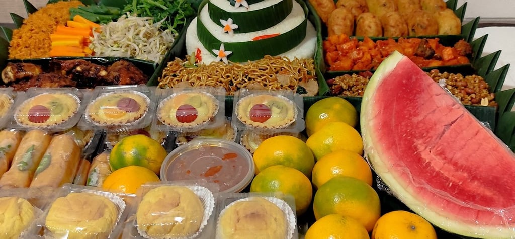 Kami menyertakan aneka kue basah premium seperti Kue SUS, buah - buahan dan kue Pai yang manis dan nikmat di dalam satu kemasan.